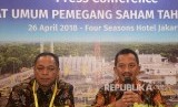 Dirut Utama PGN Jobi Triananda Hasjim (kanan) usai memberikan keterangan usai Rapat Umum Pemegang Saham Tahunan (RUPST) 2018 di Jakarta, Kamis (26/4). RUPST menyetujui pembagian deviden Rp 766,27 miliar kepada pemegang saham serta memutuskan perubahan susunan direksi dan komisaris. (FOTO : Prayogi/Republika)