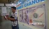 Konsumen menukarkan mata uang asing di jasa penukaran uang asing Valuta Artha Mas ITC Kuningan, Jakarta,Kamis (26/4). Nilai tukar rupiah rebound pada perdagangan Kamis (26/4), Rupiah di tutup menguat 0,22% ke posisi Rp 13.891 per dolar AS, setelah dibuka di level Rp 13.919 per dolar AS. (FOTO : Prayogi/Republika)