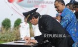 Menteri Hukum dan HAM RI, Yasonna H. Laoly, (kiri) Kepala BNN, Heru Winarko, (kanan) melakukan penandatanganan kerja sama tentang P4GN dalam upacara hari bakti pemasyarakatan ke 54 di Kantor Direktorat Jendral Pemasyarakatan, Jakarta, Jumat (27/4). (FOTO : Republika/Iman Firmansyah)