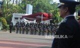 Peserta mengenakan pakaian huru hara dalam upacara hari bakti pemasyarakatan ke 54 di Kantor Direktorat Jendral Pemasyarakatan, Jakarta, Jumat (27/4). (FOTO : Republika/Iman Firmansyah)