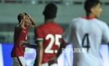 Ekspresi gelandang Timnas Indonesia Evan Dimas setelah gagal mencetak gol ke gawang Bahrain dalam laga PSSI Anniversary Cup 2018 di Stadion Pakansari, Cibinong, Bogor, Jumat (27/4) malam. (FOTO : Republika/Edwin Dwi Putranto)