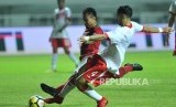 Gelandang Timnas Indonesia Febri Hariyadi mendapat hadangan dari pemain Bahrain dalam laga PSSI Anniversary Cup 2018 di Stadion Pakansari, Cibinong, Bogor, Jumat (27/4) malam. (FOTO : Republika/Edwin Dwi Putranto)