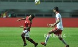 Gelandang Timnas Indonesia Osvaldo Haay berusaha mengontrol bola dibayangi pemain Bahrain Hassan Alkarrani dalam laga PSSI Anniversary Cup 2018 di Stadion Pakansari, Cibinong, Bogor, Jumat (27/4) malam. (FOTO : Republika/Edwin Dwi Putranto)