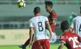 Penyerang Timnas Indonesia Lerby Eliandry melakukan sundulan kepala kearah gawang Bahrain dalam laga PSSI Anniversary Cup 2018 di Stadion Pakansari, Cibinong, Bogor, Jumat (27/4) malam. (FOTO : Republika/Edwin Dwi Putranto)