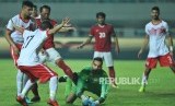 Penjaga gawang Bahrain Yusuf Shabaan mengamankan bola dari pemain Indonesia Hansamu Yama dalam laga PSSI Anniversary Cup 2018 di Stadion Pakansari, Cibinong, Bogor, Jumat (27/4) malam. (FOTO : Republika/Edwin Dwi Putranto)