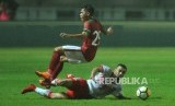 Gelandang Timnas Indonesia Septian David Maulana mendapat hadangan dari pemain Bahrain Mohamed Marhoon dalam laga PSSI Anniversary Cup 2018 di Stadion Pakansari, Cibinong, Bogor, Jumat (27/4) malam. (FOTO : Republika/Edwin Dwi Putranto)