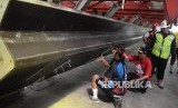 Menteri Perhubungan Budi Karya Sumadi (kedua kiri) meninjau lokasi pabrikasi beton LRT di Jakarta, Ahad (29/4). Pemerintah menargetkan pada 2023 hingga 2024 seluruh angkutan massal di jabodetabek sudah terintegrasi. Sehingga mampu menampung empat hingga lima juta orang setiap hari. (FOTO : Wihdan Hidayat/Republika)