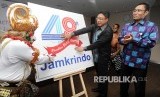 Direktur Operasional dan Jaringan Perum Jamkrindo Kadar Wisnuwarman (kedua kanan) didampingi Direktur Bisnis Penjaminan Amin Mas'udi (kanan), memasang puzzle saat peluncuran logo HUT 48 Tahun Perum Jamkrindo dan kompetisi Pelaku Usaha Rintisan (start up) di Jakarta, Senin (30/4). (FOTO : Audy Alwi/Antara)