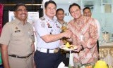 Direktur Teknologi & Operasional, Priagung Suprapto (kanan) menyerahkan potongan tumpeng Kepala Dinas Perhubungan, Andri Yansyah (tengah) didampingi Asisten Perekonomian Walikota Jakarta Timur Syofian ( kiri) pada peresmian Kantor Kas Bank DKI Terminal Terpadu Pulo Gebang di Jakarta, (30/04). (FOTO : Dok Bank DKI)
