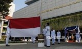 Petugas mengibarkan bendera pada upacara peringatan Hari Pendidikan Nasional di Kantor Kementerian Pendidikan dan Kebudayaan, Jakarta, Rabu (2/5). (FOTO : Republika/Putra M. Akbar)