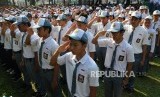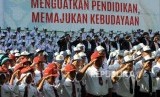 Pelajar melaksanakan upacara peringatan Hari Pendidikan Nasional di Kantor Kementerian Pendidikan dan Kebudayaan, Jakarta, Rabu (2/5). (FOTO : Republika/Putra M. Akbar)