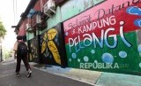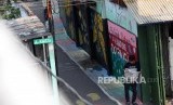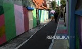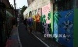 Warga berjalan di antara dinding yang dicat warna warni di Kampung Pelangi Kawasan Johar Baru, Jakarta, Rabu (2/5). (FOTO : Republika/Mahmud Muhyidin)
