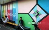 Warga duduk disamping dinding yang dicat warna warni di Kampung Pelangi Kawasan Johar Baru, Jakarta, Rabu (2/5). (FOTO : Republika/Mahmud Muhyidin)