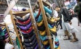 Pengunjung memilih produk outdoor saat pameran Indonesia Outdoor Festival (Indofest) 2018 di Hall B Jakarta Convention Center (JCC), Jakarta, Kamis (3/5). (FOTO : Republika/Mahmud Muhyidin)