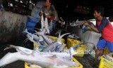 Pekerja merapihkan hiu dari keranjang di Muara Angke, Jakarta Utara, Jumat (4/5). (FOTO : Republika/Putra M. Akbar)
