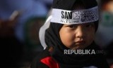 Dea (2) dari Bekasi mengikuti aksi Indonesia Bebas Al-Quds 115 di Monumen Nasional, Jakarta, Jumat (11/5). (FOTO : Republika/Mahmud Muhyidin)
