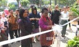 Menteri Pemberdayaan Perempuan dan Perlindungan Anak Yohana Susana Yembise (kanan) didampingi Koordinator Bluebird Peduli Noni Purnomo meninjau hasil kerajinan tangan para istri pengemudi Blue Bird yang tergabung dalam Kartini Blue Bird, usai peluncuran buku "Kartini Blue Bird : The Spirit of Emak-Emak" di Jakarta, Jumat (11/5). (FOTO : Dok Bluebird)