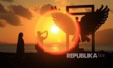 Wisatawan berfoto di patung garuda sambil menikmati suasana matahari terbit di Pantai Boom, Banyuwangi, Jawa Timur, Jumat (11/5). Kabupaten Banyuwangi yang memiliki julukan Sunrise of Java tersebut, menjadi tujuan wisatawan untuk menikmati suasana matahari terbit pertama di pulau Jawa. (FOTO : Budi Candra Setya/Antara)