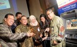 Direktur Utama Bank BTN Maryono (kedua kiri) bersama Direktur Jenderal Pajak Robert Pakpahan (kiri) dan Direktur Transformasi Teknologi Informasi dan Komunikasi Ditjen Pajak Iwan Djuniardi (kanan) mencoba kartu NPWP BTN Pintar usai peluncurannya di Jakarta, Senin (14/5). (FOTO : Prayogi/Republika)