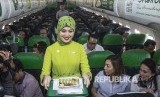 Pramugari maskapai Citilink Indonesia berseragam hijab menyajikan makanan dalam penerbangan perdana seragam baru Citilink Indonesia rute Jakarta-Surabaya, Senin (14/5). (FOTO : Aprillio Akbar/Antara)