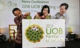 Kepala Galeri Nasional Indonesia Pustanto, Head of Corporate Communications UOB Indonesia Maya Rizano dan Channels Director UOB Indonesia Pardi Kendy (kiri-kanan) bersama-sama menuangkan cat kedalam papan logo UOB Painting of the Year 2018 pada acara peluncuran kompetisi UOB Painting of the Year 2018 di Jakarta, Selasa (15/5). (FOTO : Darmawan/Republika)