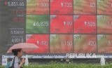 Pekerja melintas dengan latar belakang pergerakan Indeks harga saham gabungan (IHSG) di Jakarta, Selasa (15/5). IHSG kembali ditutup melemah, turun hingga 1,83 persen ke level 5.838. Sejak perdagangan dibuka, IHSG sudah terkoreksi 0,35 persen di level 5.926. (FOTO : Muhammad Adimaja/Antara)