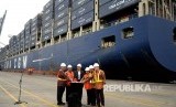Presiden Joko Widodo (tengah) bersama jajaran menteri menekan tombol pelepasan ekspor manufaktur menggunakan kapal besar di Pelabuhan Tanjung Priok, Jakarta, Selasa (15/5). Dengan menggunakan kapal kontainer raksasa ukuran 10.000 TEUs, bobot 95.263 GT, dan panjang 300 meter ini akan menuju Los Angles, AS. (FOTO : Wihdan Hidayat/Republika)