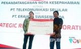 Wakil Presiden Direktur & CEO Erajaya Group Hasan Aula (kiri) dan Direktur Sales Telkomsel Sukardi Silalahi (kanan) berfoto bersama usai penandatanganan kerjasama program 'Halo Device Plan' di Jakarta, Selasa (15/5). Program bundling ini menawarkan beragam pilihan smartphone bagi pengguna Telkomsel pasca bayar. (FOTO : Yogi Ardhi/Republika)