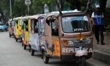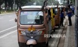 Sejumlah Bajaj yang dimodifikasi berbentuk Maskot Asian Games Bhin Bhin (Burung Cendrawasih), Atung (Rusa Bawean), dan Kaka (Badak Bercula Satu) terparkir di Kawasan Monas, Jakarta, Rabu (16/5). (FOTO : Republika/Mahmud Muhyidin)