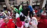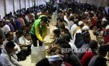 Petugas membagikan makanan kepada warga saat berbuka puasa bersama di Masjid Istiqlal, Jakarta, Kamis (17/5). (FOTO : Republika/Mahmud Muhyidin)