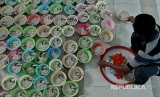 Seorang pengurus masjid menata sejumlah mangkuk bubur India untuk hidangan berbuka puasa, di Masjid Jami Pekojan Semarang, Jawa Tengah, Jumat (18/5). Pengurus masjid menyediakan sekitar 200 mangkuk bubur India setiap hari selama bulan Ramadan untuk menu berbuka puasa. (FOTO : R Rekotomo/Antara)