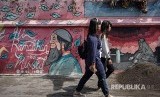 Warga melintas di depan mural bernuansa islami di Kampung Laweyan, Solo, Jawa Tengah, Jumat (18/5). Memasuki bulan Ramadan 1439 H berbagai cara dilakukan masyarakat untuk menyambutnya salah satunya dengan mural bernuansa islam. (FOTO : Mohammad Ayudha/Antara)