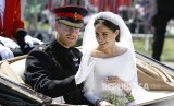 Meghan Markle bersama Pangeran Harry menaiki kerea kuda setelah upacara pernikahan mereka di Kapel Istana Windsor, di Windsor, Inggris, Sabtu (19/5) waktu setempat. (FOTO : Jeff J Mitchell/pool photo via AP))