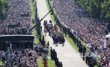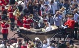 iring-iringan kereta kuda yang membawa pasangan Meghan Markle bersama Pangeran Harry setelah upacara pernikahan mereka di Kapel Istana Windsor, di Windsor, Inggris, Sabtu (19/5) waktu setempat. (FOTO : Yui Mok/PA Wire)