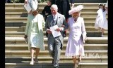 Pangeran Charles (tengah) Doria Raglan (kiri) dan Camilla Duchess of Cornwall menuruni tangga setelah upacara pernikahan mereka di Kapel Istana Windsor, di Windsor, Inggris, Sabtu (19/5) waktu setempat. (FOTO : Ben Stansall/pool photo via AP)