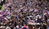 Warga menanti pasangan Meghan Markle bersama Pangeran Harry melintas setelah upacara pernikahan mereka di Kapel Istana Windsor, di Windsor, Inggris, Sabtu (19/5) waktu setempat. (FOTO : Emilio Morenatti/AP)