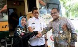 Penukaran Pecahan Rupiah. Deputi Gubernur Bank Indonesia Rosmaya Hadi, Wakil Gubernur DKI Jakarta Sandiaga Uno, dan Direktur Teknologi dan Operasional Bank Syariah Mandiri Achmad Syafii (dari kiri) berjabat tangan saat meninjau pelayanan penukaran uang pecahan kecil di mobil kas keliling Bank Syariah Mandiri di Lapangan IRTI Monas, Jakarta, Rabu (23/5). (FOTO : Republika/ Wihdan)