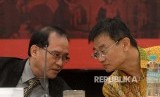 Direktur Utama PT Duta Pertiwi Tbk Teky Mailoa (kanan) berbincang dengan Direktur Stevanus Hartono Adjiputro saat memberikan keterangan hasil Rapat Umum Pemegang Saham Tahunan di ICE, Serpong, Banten, Rabu (23/5). Sepanjang 2017 PT Duta Pertiwi Tbk mencetak pendapatan usaha sebesar Rp 1,72 triliun dan laba bersih sebesar Rp 535,31 miliar. (FOTO : Prayogi/Republika)