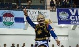 Seorang suporter dengan menggunakan kostum wayang menyaksikan laga lanjutan Go-jek Liga 1 antara Persib Bandung melawan PSM Makasar di Stadion Gelora Bandung Lautan Api (GBLA), Bandung, Jawa Barat, Rabu (23/5) malam. (FOTO : Raisan Al Farisi/Antara)