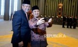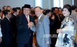 Pelantikan Gubernur Bank Indonesia. Gubernur Bank Indonesia Perry Warjiyo (kiri) menerima ucapan selamat dari mantan Wapres Boediono usai pelantikan di Mahkamah Agung, Jakarta, Kamis (24/5). (FOTO : Republika/ Wihdan)
