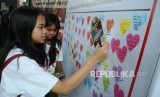Pengunjung menempelkan pesan dan dukungan untuk pembuatan perda dan implementasi kawasan tanpa rokok pada pameran seni instalasi dalam rangka memperingati Hari Tanpa Tembakau Sedunia yang digelar Pemerintah Kota Bandung, di Taman Film, Kota Bandung, Ahad (27/5). (FOTO : Republika/Edi Yusuf)