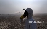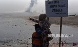 Seorang ibu bersama anaknya korban lumpur Lapindo menunjuk pusat semburan dari titik 25 tanggul penahan lumpur Lapindo saat aksi memperingati 12 tahun semburan lumpur Lapindo di Porong, Sidoarjo, Jawa Timur, Selasa (29/5).  (FOTO : Antara/Zabur Karuru)