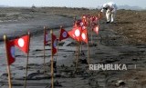 Aktivis Walhi memasang bendera di titik 25 tanggul penahan lumpur Lapindo saat aksi memperingati 12 tahun semburan lumpur Lapindo di Porong, Sidoarjo, Jawa Timur, Selasa (29/5). (FOTO : Antara/Zabur Karuru)