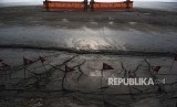 Aktivis Walhi berjalan di titik 25 tanggul penahan lumpur Lapindo saat aksi memperingati 12 tahun semburan lumpur Lapindo di Porong, Sidoarjo, Jawa Timur, Selasa (29/5). (FOTO : Antara/Zabur Karuru)