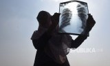 Seorang warga korban lumpur Lapindo menunjukan foto hasil rontgen di titik 25 tanggul penahan lumpur Lapindo saat aksi memperingati 12 tahun semburan lumpur Lapindo di Porong, Sidoarjo, Jawa Timur, Selasa (29/5). (FOTO : Antara/Zabur Karuru)