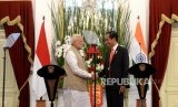 Kunjungan PM India. Presiden Joko Widodo (kanan) bersama PM India Narendra Modi usai memberikan keterangan pers bersama saat kunjungan kenegaraan di Istana Merdeka, Jakarta, Rabu (30/5). (FOTO : Republika/ Wihdan)