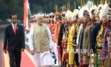 Kunjungan PM India. Presiden Joko Widodo (tengah) bersama PM India Narendra Modi (kanan) meninjau pasukan saat kunjungan kenegaraan di Istana Merdeka, Jakarta, Rabu (30/5). (FOTO : Republika/ Wihdan)