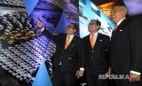 Direktur Utama PT Indonesia Kendaraan Terminal Tbk Chiefy Adi Kusmargono (kiri), Direktur Keuangan dan Sumber Daya Manusia Sugeng Mulyadi (tengah) dan Direktur Komersial dan Pengembangan Bisnis Arif Isnawan, mengamati poster barisan kendaraan di pelabuhan, sebelum Penawaran Umum Perdana Saham PT Indonesia Kendaraan Terminal Tbk, di Jakarta, Senin (28/5). (FOTO : Audy Alwi/Antara)
