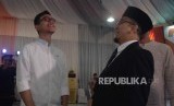 Anak Presiden Joko Widodo Gibran Rakabuming . Pendiri Paytren , Ustaz Yusuf Mansur (kanan) dalam acara peluncuran uang elektronik paytren dii Tangerang, Banten, Jumat (1/6). (FOTO : Republika/Iman Firmansyah)