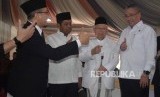 Ustaz Yusuf Mansur, Menteri sosial Idrus Matham, Ketua MUI K.H Maaruf Amiin, Menteri Desa PDTT, Eko Putro Sandjojo (kiri ke kanan) bersiap untuk berfoto dalam acara peluncuran uang elektronik paytren dii Tangerang, Banten, Jumat (1/6). (FOTO : Republika/Iman Firmansyah)